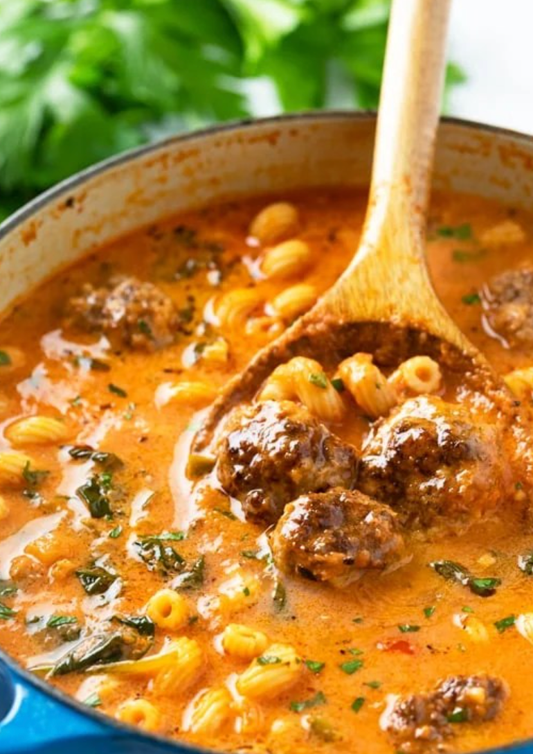 Cette soupe aux boulettes de viande est un plat réconfortant avec un bouillon savoureux à base de tomate, enrichi d’assaisonnements italiens, de pâtes, d’épinards et de poivrons….